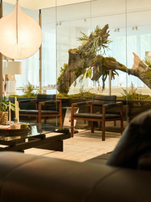 步入2层,散落的绿植景观如同一座座微型绿色岛礁,以盎然的原野面貌,串联起宛如“群岛”般的自然之境,原木阑珊、黑色立柱、透明隔断、洞石墙身..…数十种天然材料融合,碰撞出自然美学的独特意境,交织着自然与摩登的相逢与气息,让整个空间呼应自然岛屿。