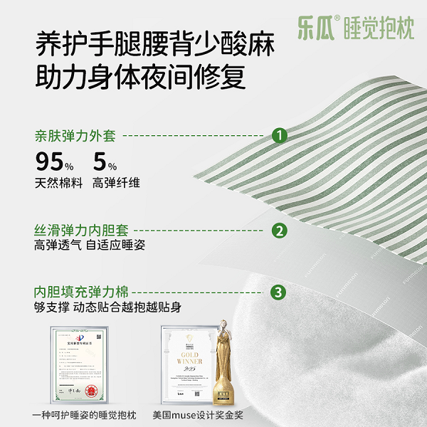 这个集创新设计与实用功能于一体的卓越产品–乐瓜睡觉抱枕(Sleeping  Body  Pillow),不仅获得了国家知识产权局认可的“一种呵护睡姿的睡觉抱枕”实用专利证书,还在2025年先后斩获了美国MUSE设计奖金奖和加拿大顶尖设计竞赛奖4 Future Awards。