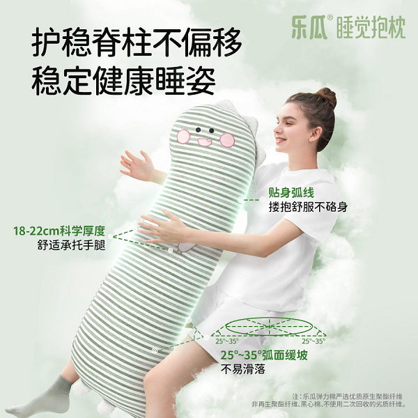乐瓜睡觉抱枕(Sleeping  Body  Pillow)的核心在于其科学分区设计。它为手臂与腿部的提供了稳定而均衡的支撑,有效减少因身体悬空或扭曲导致的肌肉代偿,从而从源头上预防和缓解睡姿不当引发的圆肩、驼背等问题。其独特的25°–35°弧面缓坡设计,如同一个稳定的“防滑坡道”,让手臂和腿部在整夜睡眠中不轻易滑落,将身体维持在正确的生理线位上,从源头截断不良睡姿的伤害累积。
