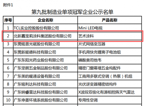近日,北新嘉宝莉凭借其核心产品“艺术涂料”,荣耀入选第九批国家级制造业单项冠军示范企业名单。这是继尚普咨询此前授予的“中国艺术涂料开创者”、“中国艺术涂料领导品牌”等四项权威认证后获得的又一殊荣,标志着嘉宝莉在艺术涂装材料领域的科技实力、市场地位与品牌影响力达到行业领先水平,获得国家权威认可!