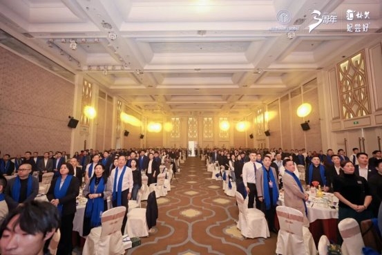 来宾们在主题背景墙前合影留念,共同纪念协会成立三周年的盛况。现场大屏幕循环播放协会宣传视频与主题画面,营造出庄重而温馨的会议氛围。