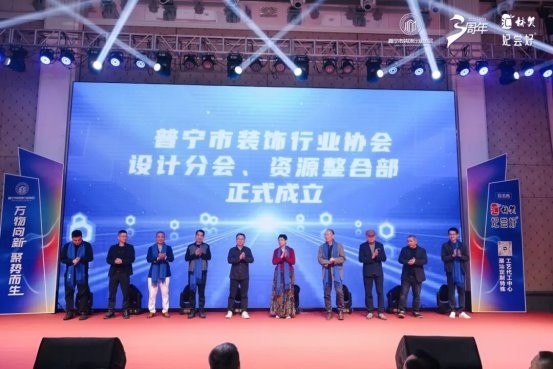 当晚最重要的环节之一——设计分会与资源整合部成立启动仪式隆重举行。普宁市民政局陈瑞茂副局长、广东省陈设艺术协会会长胡小梅、CIID中室学广东学术委员会主任郑少文 、普宁市装饰行业协会会长王奕健、汕头市装饰行业协会常务副会长/设计分会会长 郭少雄、揭阳市建筑装饰协会会长郭晓林、潮州市装饰行业协会会长许海鹰、梅州市装饰行业协会执行会长执行会长陈锦龙、普宁市装饰行业协会副会长兼设计分会会长黄祖佳、普宁市装饰行业协会副会长兼资源整合部负责人赖豪杰共十人共同上台,将手按向启动台。随着倒计时结束,光柱亮起,“正式成立”字样闪耀在大屏上,标志着普宁装饰行业设计力量与产业资源整合的新平台正式扬帆起航,全场响起热烈掌声。