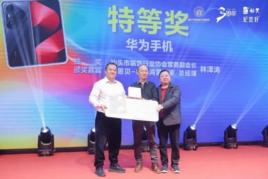 特等奖:压轴的华为手机由康思贝-华为鸿蒙智家总经理林泽涛先生抽出,将晚宴的幸运氛围推向顶峰。